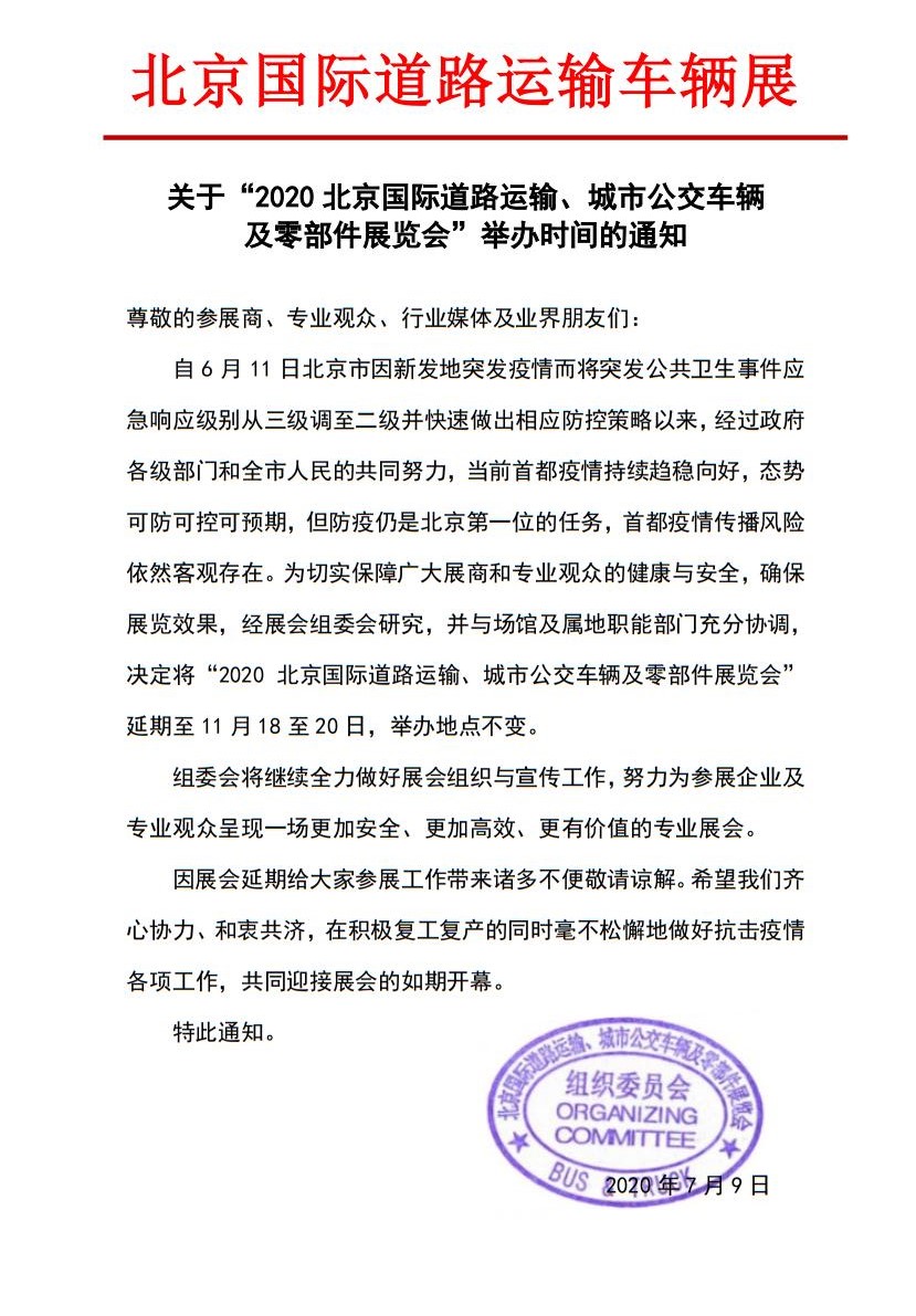 自6月11日北京市因新發(fā)地突發(fā)疫情而將突發(fā)公共衛(wèi)生事件應(yīng)急響應(yīng)級(jí)別從三級(jí)調(diào)至二級(jí)并快速做出相應(yīng)防控策略以來,經(jīng)過政府各級(jí)部門和全市人民的共同努力,當(dāng)前首都疫情持續(xù)趨穩(wěn)向好,態(tài)勢可防可控可預(yù)期,但防疫仍是北京第一位的任務(wù),首都疫情傳播風(fēng)險(xiǎn)依然客觀存在。為切實(shí)保障廣大展商和專業(yè)觀眾的健康與安全,確保展覽效果,經(jīng)展會(huì)組委會(huì)研究,并與場館及屬地職能部門充分協(xié)調(diào),決定將“2020北京國際道路運(yùn)輸、城市公交車輛及零部件展覽會(huì)”延期至11月18至20日,舉辦地點(diǎn)不變。