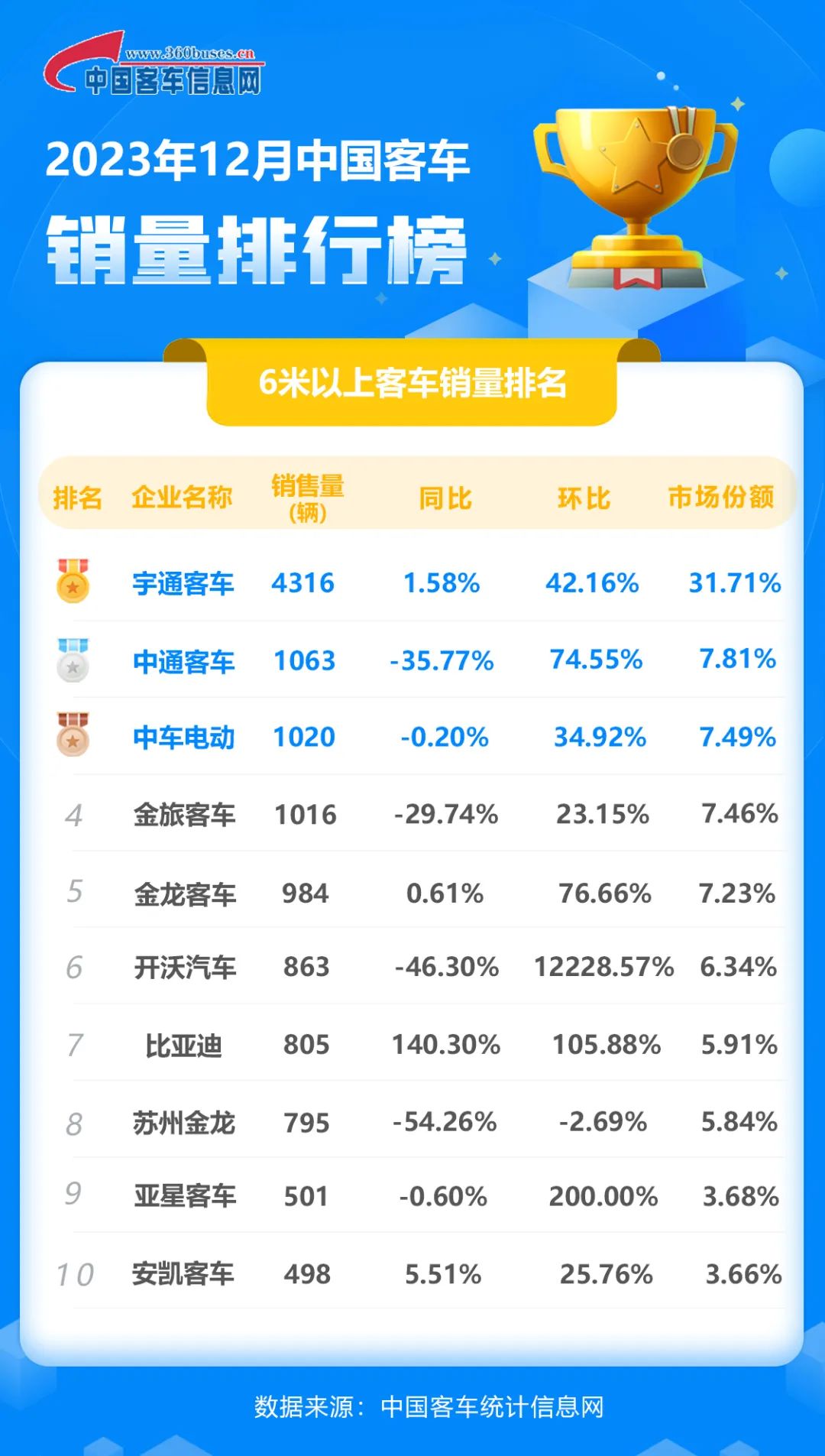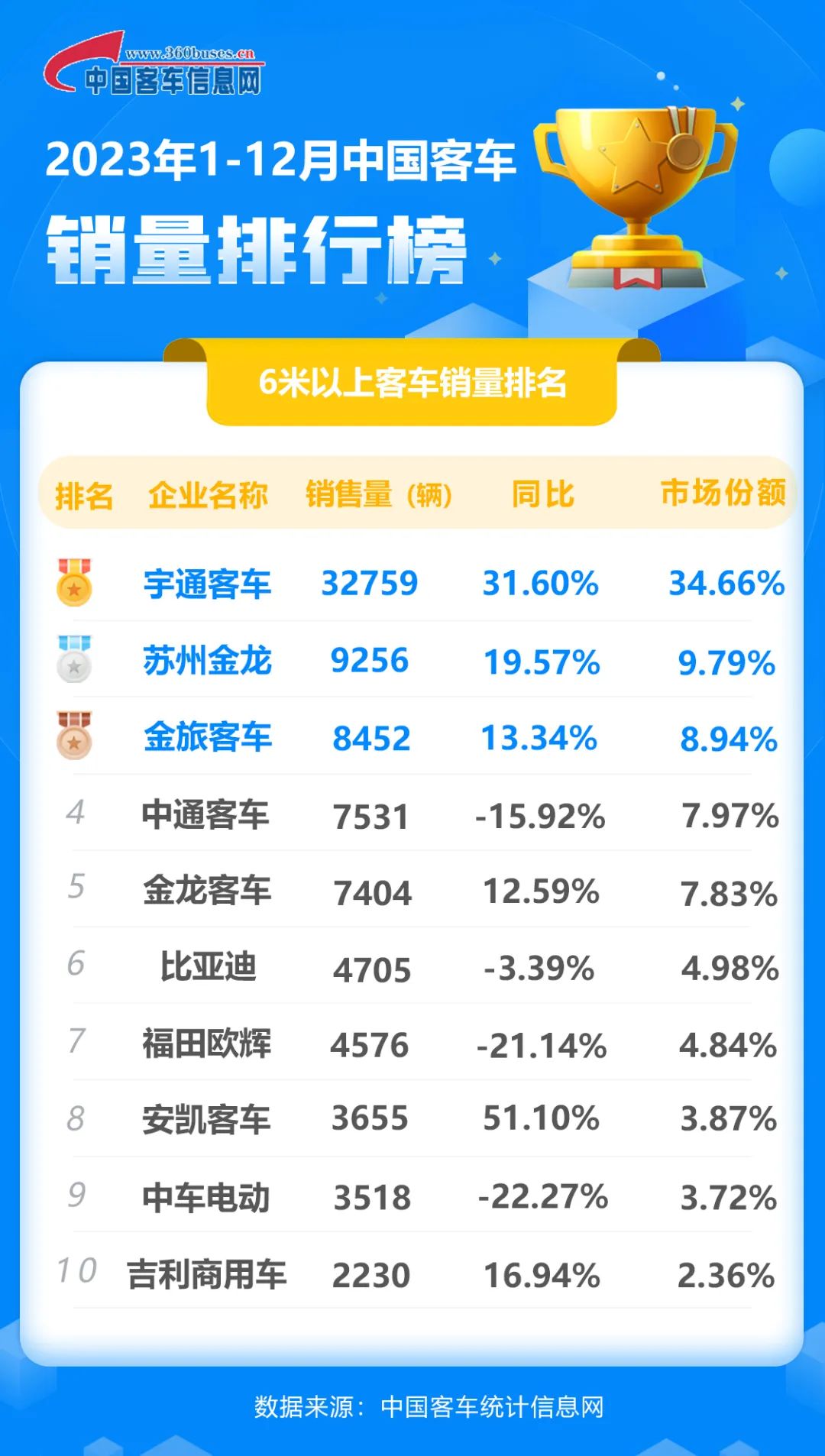 2023年全年:宇通強勢霸榜,海格金旅挺進前三,安凱同比增幅最高